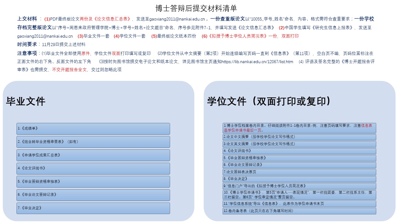 博士生答辩结束后需要及时准备各种毕业及申请学位的材料,需要提交的材料清单分别如下: