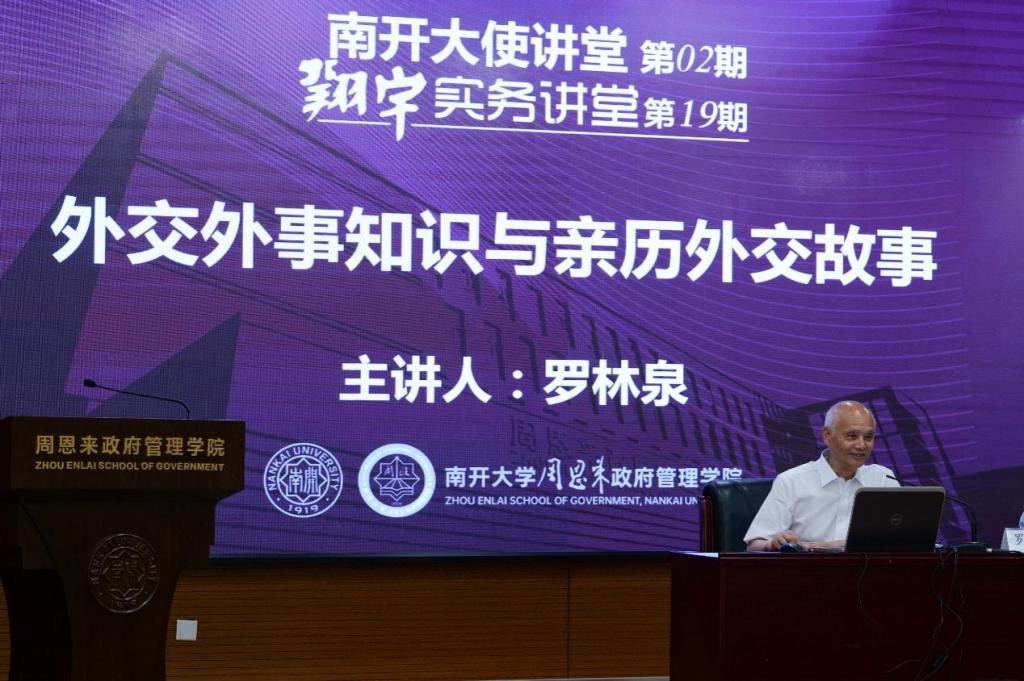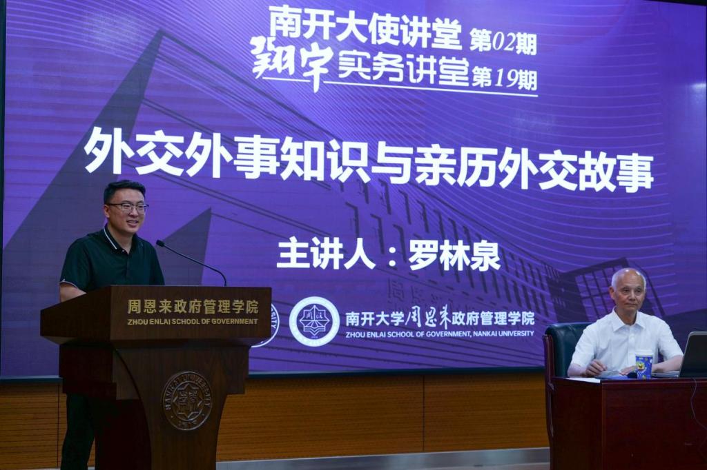 “南开大使讲堂”第2期暨翔宇“实务讲堂”第19期在政府管理学院128报告厅举行。本期讲座特别邀请了外交部礼宾司原司长、前中国驻纽约总领事馆副领事、前外交部驻香港特别行政区特派员公署参赞、前中国驻希腊共和国特命全权大使、前中国驻爱尔兰特命全权大使、前中国驻旧金山总领事(大使衔)罗林泉大使,以《外交外事知识与亲历外交故事》为主题,为现场师生带来了一场精彩的讲座。政府学院党委书记王慧、副院长张发林教授、刘兴华教授、王耀辉博士和李圣达博士等出席。本次讲座由张发林教授主持,近百名南开师生参加,现场气氛热烈。