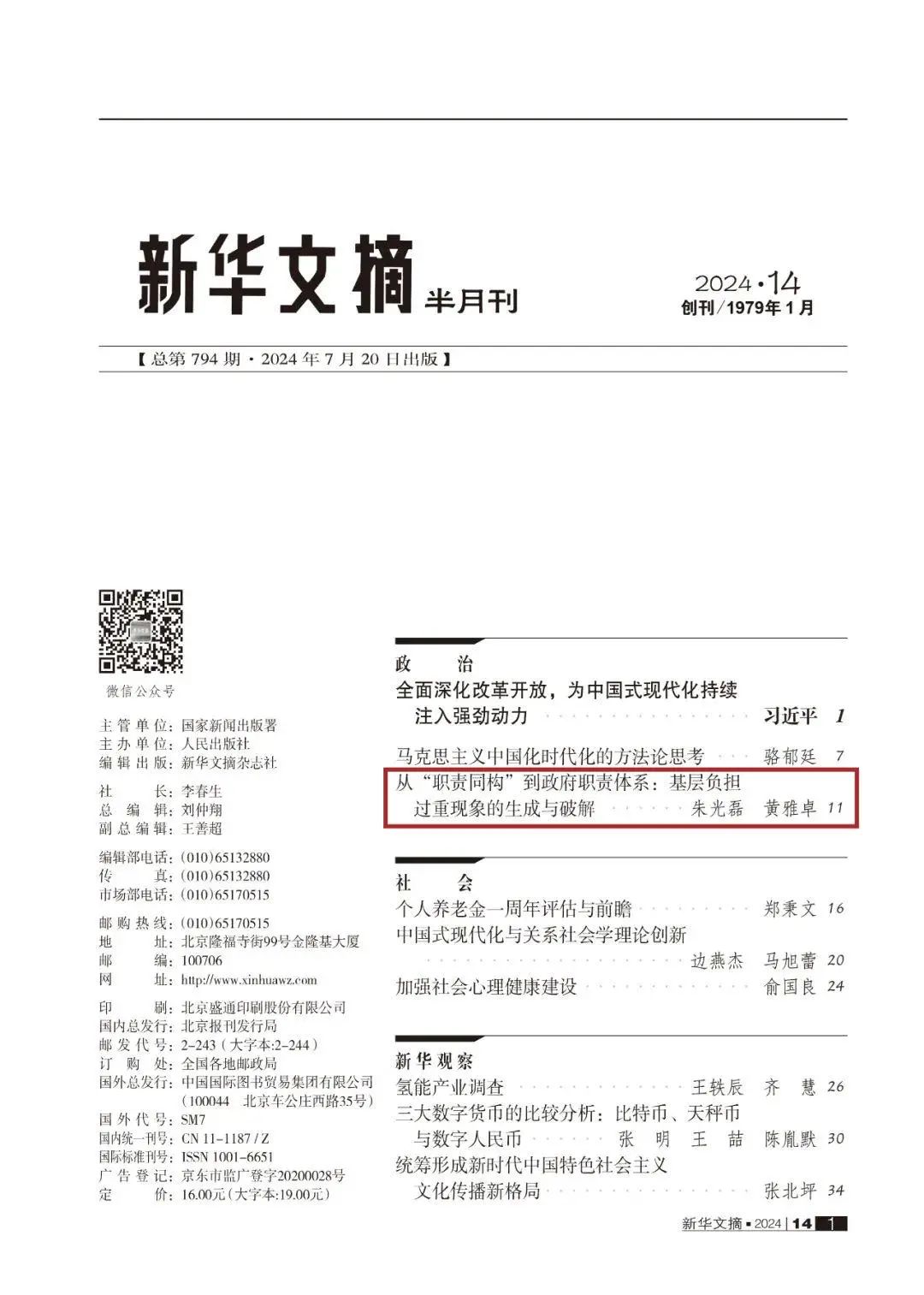 中国政府发展联合研究中心主任朱光磊教授、黄雅卓博士生的研究成果《从“职责同构”到政府职责体系:基层负担过重现象的生成与破解》(发表于《中国行政管理》2024年第4期)被全文转载。