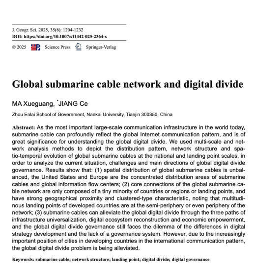教授马学广与其指导的博士生蒋策合作完成的论文“Global submarine cable network and digital divide”发表在地理科学领域国际权威SCI期刊Journal of Geographical Sciences(//doi.org/10.1007/s11442-025-2364-x)。