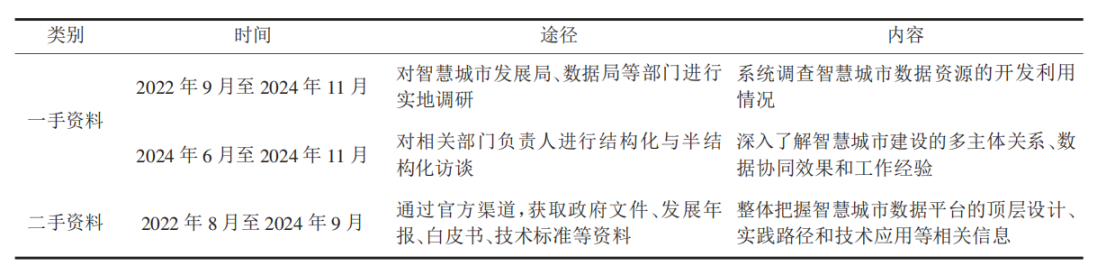 论文指出,在数字化转型加速推进的当下,“数据协同”已成为公共治理中的共性难题,尤其是在以“条块分割”为特征的中国行政体制中,跨部门数据共享与交互更受到深层次制度约束。而部分基于同样制度条件的城市却在智慧城市建设中实现了系统性、规模化的数据协同。围绕这一现象,论文重点回应了三个核心研究问题:在智慧城市的跨域数据协同中,中国地方政府的创新实践呈现何种新型治理模式?其运行机制何在?而传统科层制权力结构又是如何被悄然重塑的?为了探究其背后的实现逻辑,论文以中新天津生态城为例,运用深度案例研究方法,对智慧城市建设中的数据协同机制进行系统考察(表1)。