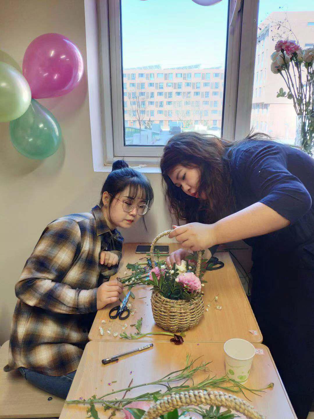 津南校区2B宿舍党团活动室,通过花艺体验,展示了当代女大学生的知性美,提升了对美好生活的向往,并且通过插花作品义卖的形式,积极播撒爱心,践行雷锋精神。