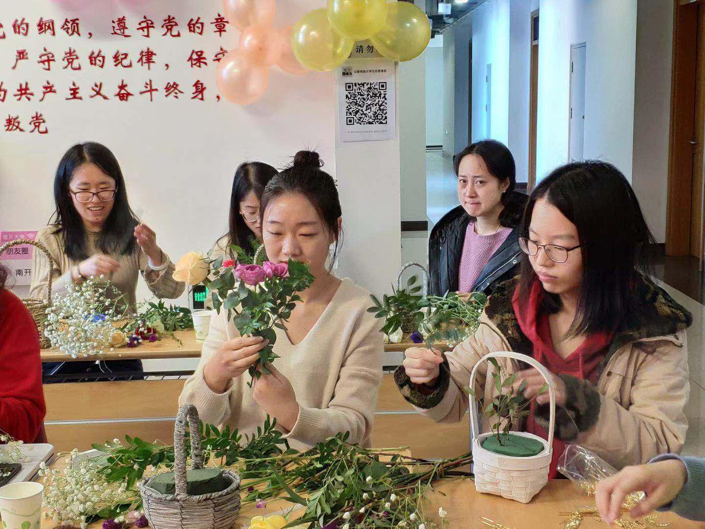 在温馨的党团活动室,女同学们在花艺老师的指导下侍弄着花草。康乃馨、桔梗花、小雏菊、玫瑰、百合......十余种花草在一双双巧手雕琢下各展风姿,或清新淡雅,或高端大气,或色彩绚烂,或新颖创意。与此同时,也有一些女同学摇身一变成为手工达人,在绚丽的珠钗中创造独特的饰品。经过一个多小时的手工制作,一盆盆主题鲜明的插花作品和一串串精美绝伦的手工饰品就呈现在同学们面前。活动现场气氛融洽,女同学脸上洋溢着幸福的笑容。参与活动的王雪珂同学表示:“在女生节这一天,可以和同学们在学生成长社区以这样独特的方式度过,是一件非常有意义的事情。我们不仅在插花的过程中陶冶了情操,缓解了研究生学习压力,还丰富了课余生活,展示了政府学院的女生风尚以及个性化的创造能力。”与此同时,拍照留念环节,一位手拿自己亲手制作的精美花篮的女生向我们说:“今天的女生节特别有纪念意义,让我觉得在南开做女生是一件特别幸福的事。”