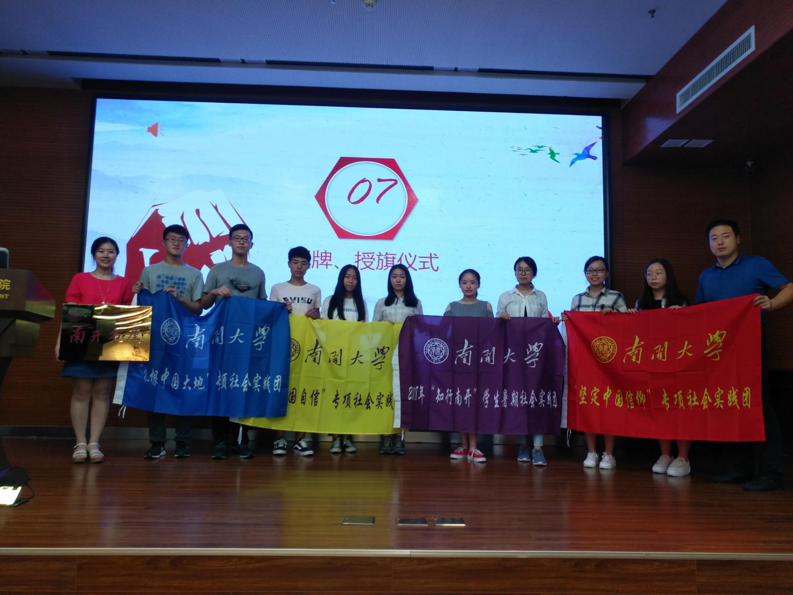 接下来进行了授牌、授旗仪式,高磊老师与王燕老师为实践队代表授予实践队队旗、三个专项的分队旗以及“南开书屋”的牌子。最后王燕老师带领现场的各实践队代表们一起宣誓。大会在热烈的掌声中圆满结束。