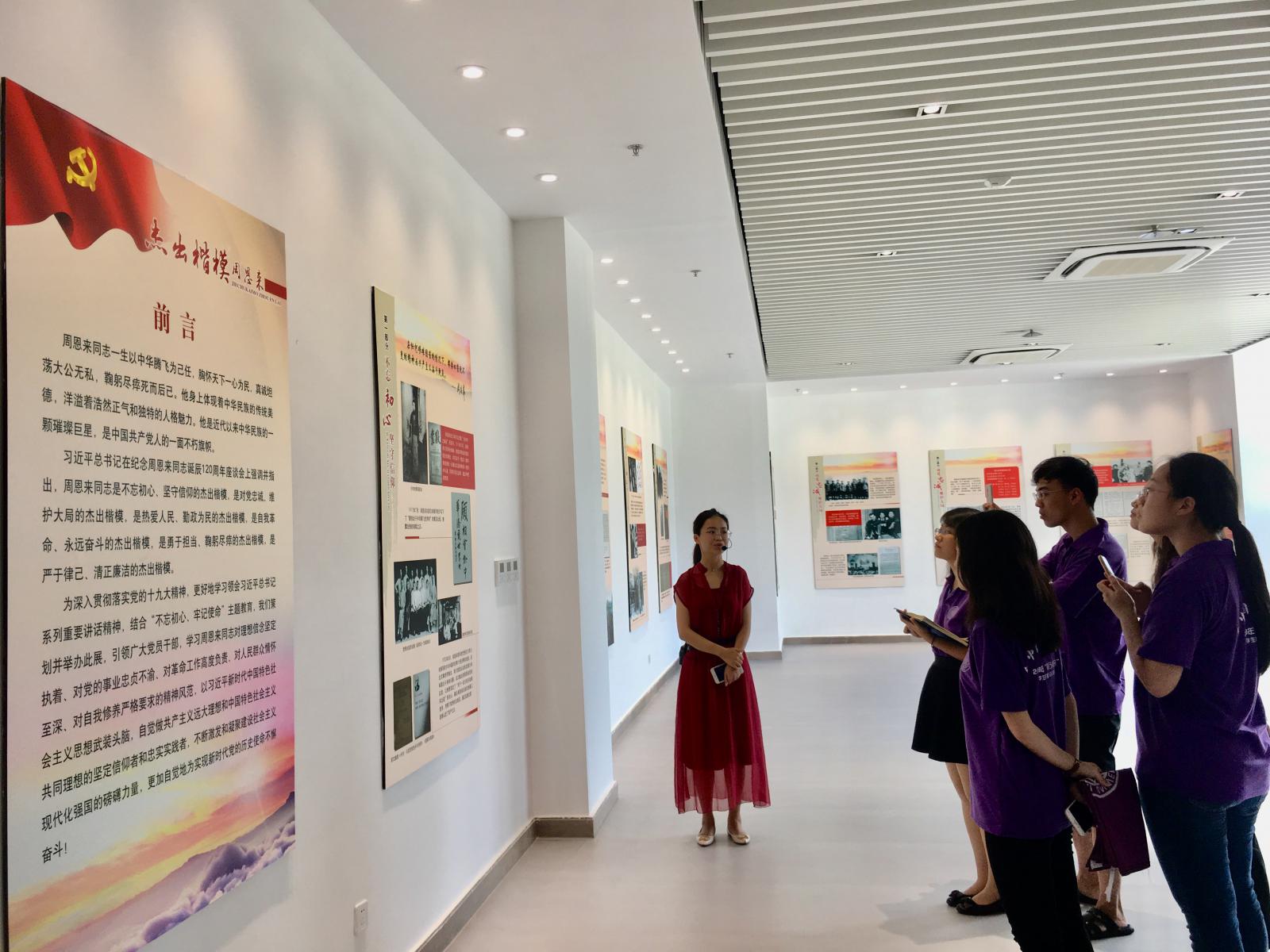 7月24日—26日,实践队来到恩来干部学院交流学习。恩来干部学院致力于通过现场教学、情境教学、专题教学、音像教学等多种教学形式打造精品课程,为党员干部开展党性培训。首先,恩来干部学院刘玮老师带领实践队参观了学院“杰出楷模周恩来”专题展,专题展通过“不忘初心、坚守信仰”“对党忠诚、维护大局”“热爱人民、勤政为民”“自我革命、永远奋斗”“勇于担当、鞠躬尽瘁”“严于律己、清正廉洁”六个方面,详实生动地展示了周总理的崇高品格。随后,刘玮老师与队员们同走学院“追梦之路”,“追梦之路”通过浮雕、海棠等不同的文化景观,再现了一件件周总理严于律己、心系人民的故事,令队员们深受感动。