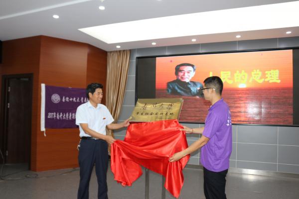 社会实践基地挂牌交接仪式。接下来,双方交换纪念品,展演团向纪念馆赠送了恩来故事中英对译纪念集以及美国A片
