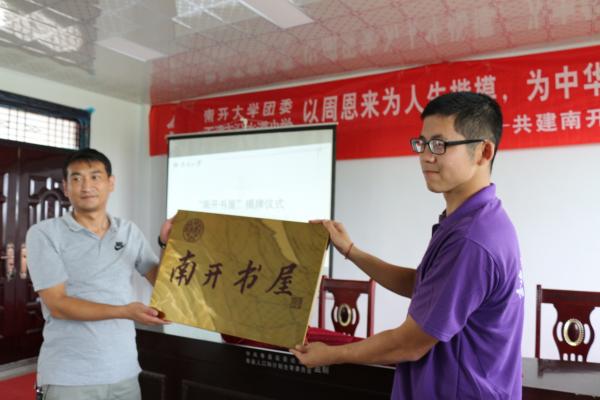 兼职辅导员杨铭与邸云功委员为“南开书屋”揭牌。