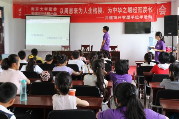 随后,恩来精神展演团代表郑滢滢讲话。她用南开校训“允公允能,日新月异”诠释了南开学子追求公能精神的志向,表达了展演团暑期社会实践队对堰口镇领导大力支持的感谢和展演团全体成员对于建设南开书屋和圆满完成支教任务的十足信心。