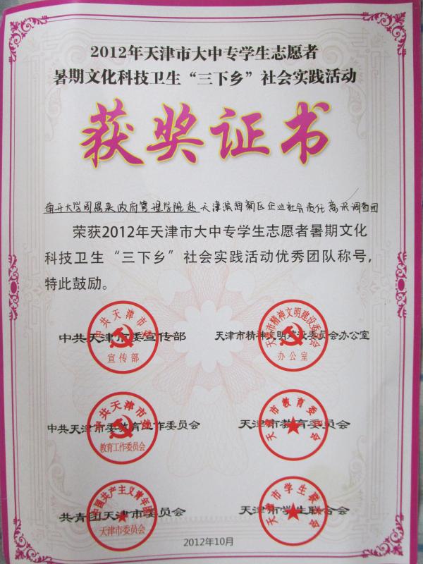 赴滨海新区经济和信息化委员会暑期社会实践队再获佳绩,荣获2012年天津市大中专学生志愿者暑期文化科技卫生“三下乡”社会实践活动优秀团队称号,团队成员齐亮荣获2012年天津市大中专学生志愿者暑期文化科技卫生“三下乡”社会实践活动先进个人称号。