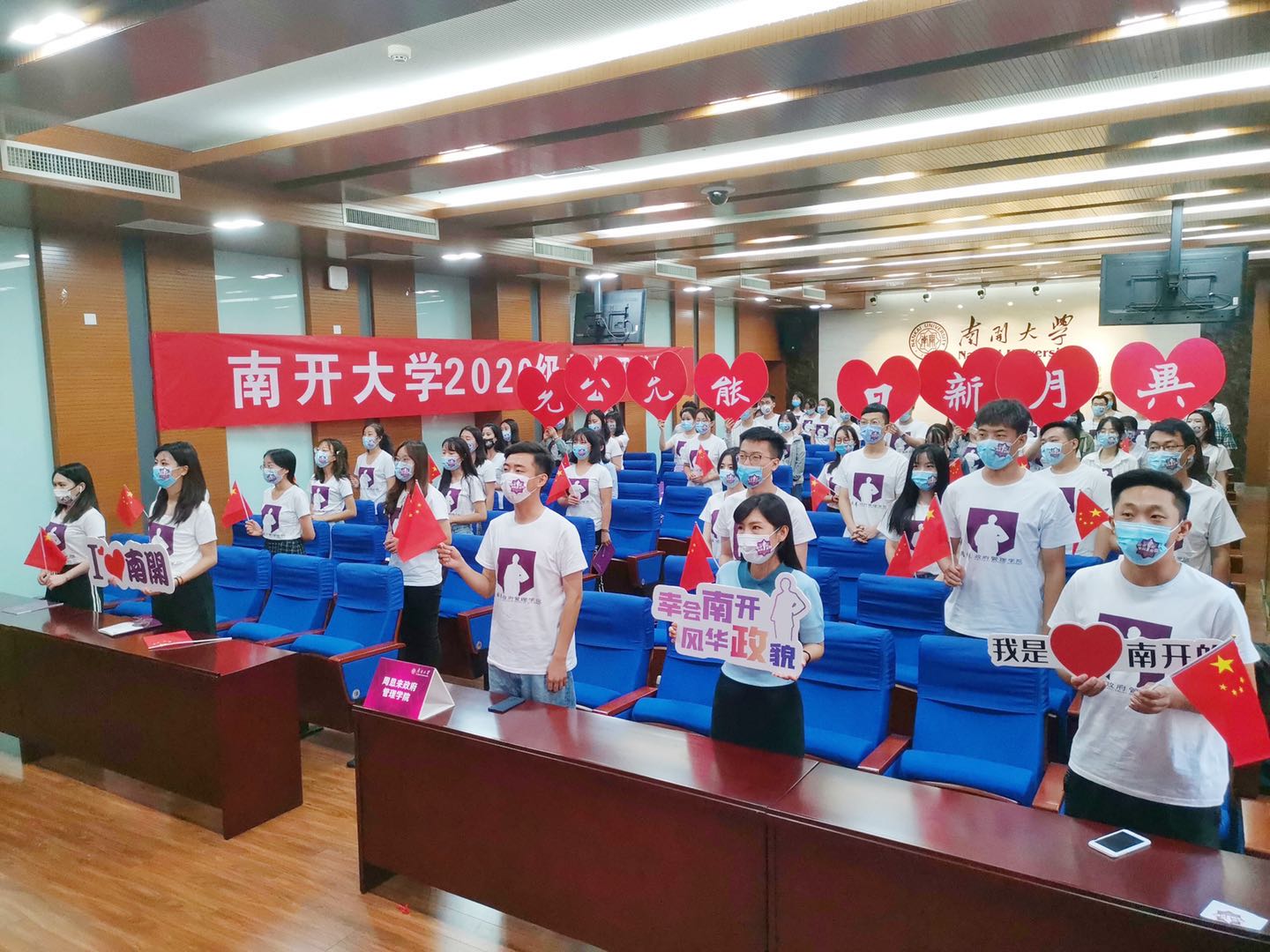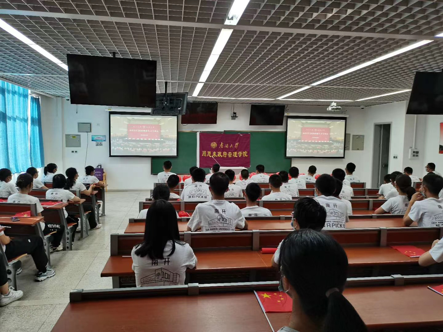 八大分会场学生隔位、错列就座,身着院衫,衣着整洁庄重,精神面貌良好。在奏唱国歌、宣读南开容止格言、回答校长爱国三问、齐唱校歌时,各分会场全体师生起立进行,以饱满的精神状态参与互动。开学典礼后,所有新生收看张健教授带来的校情校史教育讲座。