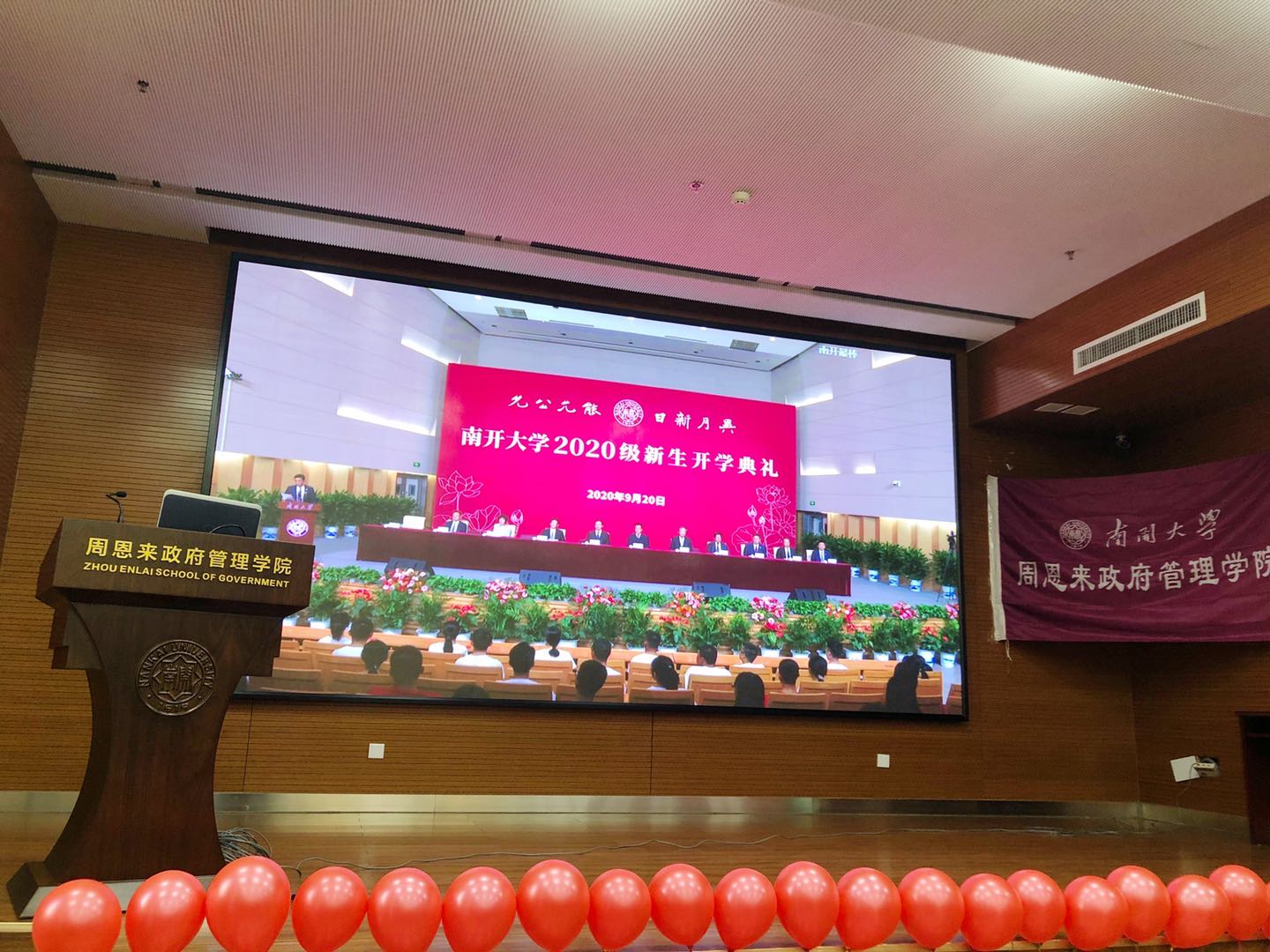 9月20日,美国A片 在田家炳音乐厅隆重举行2020级新生开学典礼,受疫情影响,采用线上线下相结合的方式。政府学院选派20名新生作为代表亲临典礼现场,其余四百余名新生在学院报告厅、会议室及津南校区公共教学楼阶梯教室等8个分会场认真观看直播.