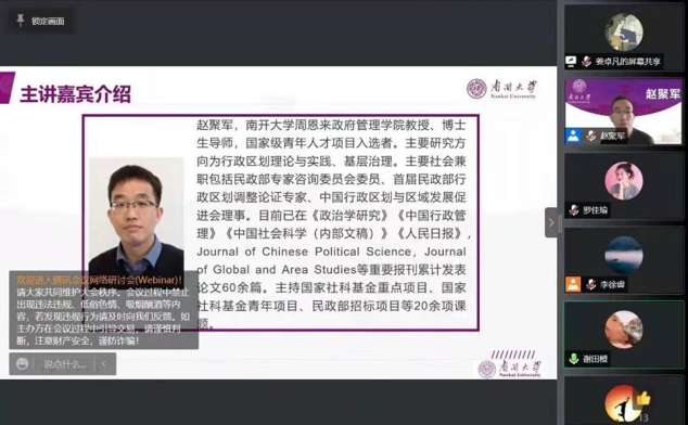 教授、博士生导师、国家级青年人才项目入选者赵聚军老师作为主讲嘉宾,赵聚军老师围绕“建党百年的行政区划策略的演进与新时代行政区划调整的三重逻辑”的主题,为同学们带来了一场内容充实的精彩讲座。