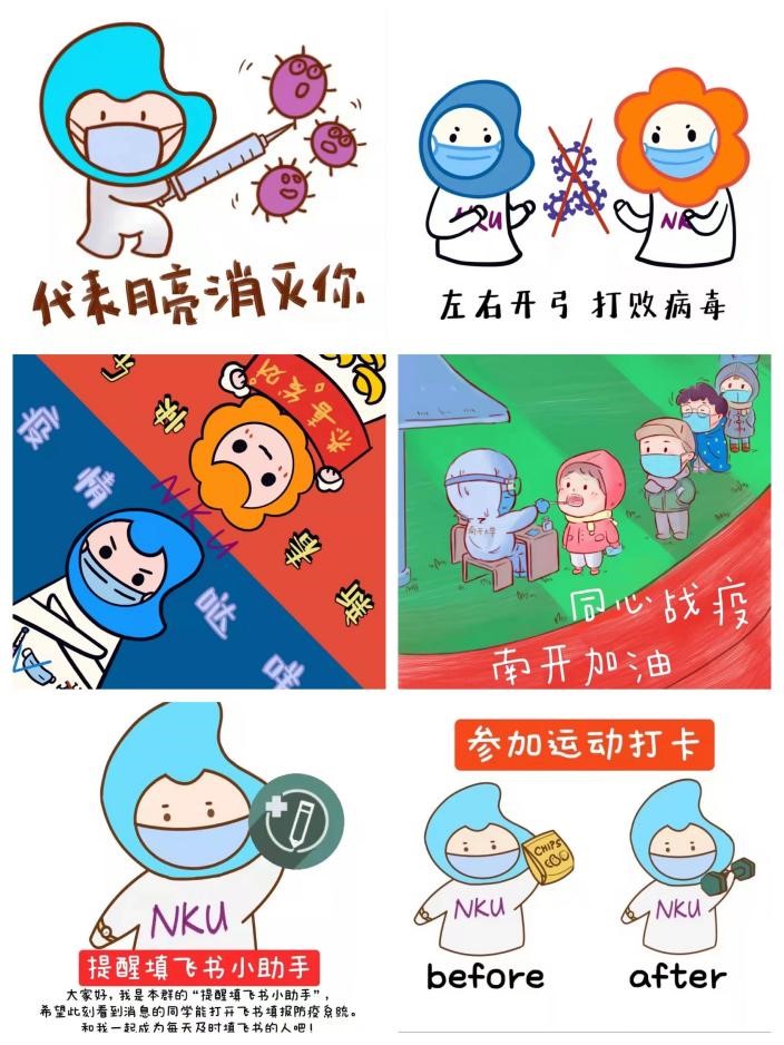 2021级本科生高雅说:“疫情发生以来,有无数南开人万众一心奋战在抗疫一线。我们看到、听到了南开人的认同感和归属感,因此我们希望通过小小的画笔将我们周政学子内心最真挚的感情和祝愿表达出来,致敬这些用行动诠释担当、用辛劳书写奉献的南开人!”