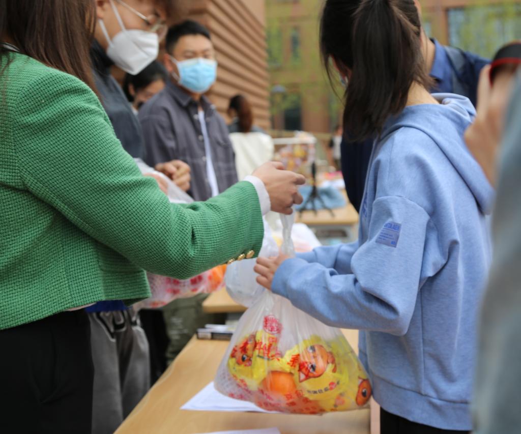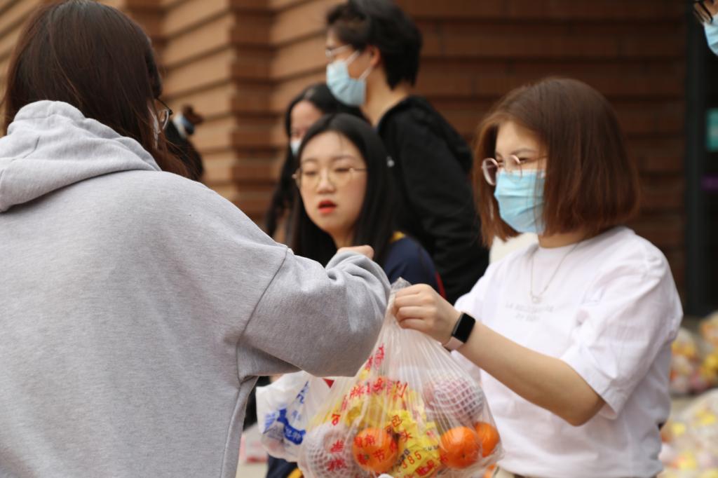 在物资发放的过程中,学院门前整齐摆放着苹果、沃柑和牛奶等各类物资,辅导员老师及团学骨干、学生志愿者认真清点、装袋分发,组织同学们有序排队、错峰领取。学院党委书记王慧充分肯定了同学们对学校防疫工作的支持与配合,她表示:“如果同学们在学习生活中遇到任何问题,都可以和老师及时沟通交流,学院方面一定会为同学们的校园生活提供全力保障。”