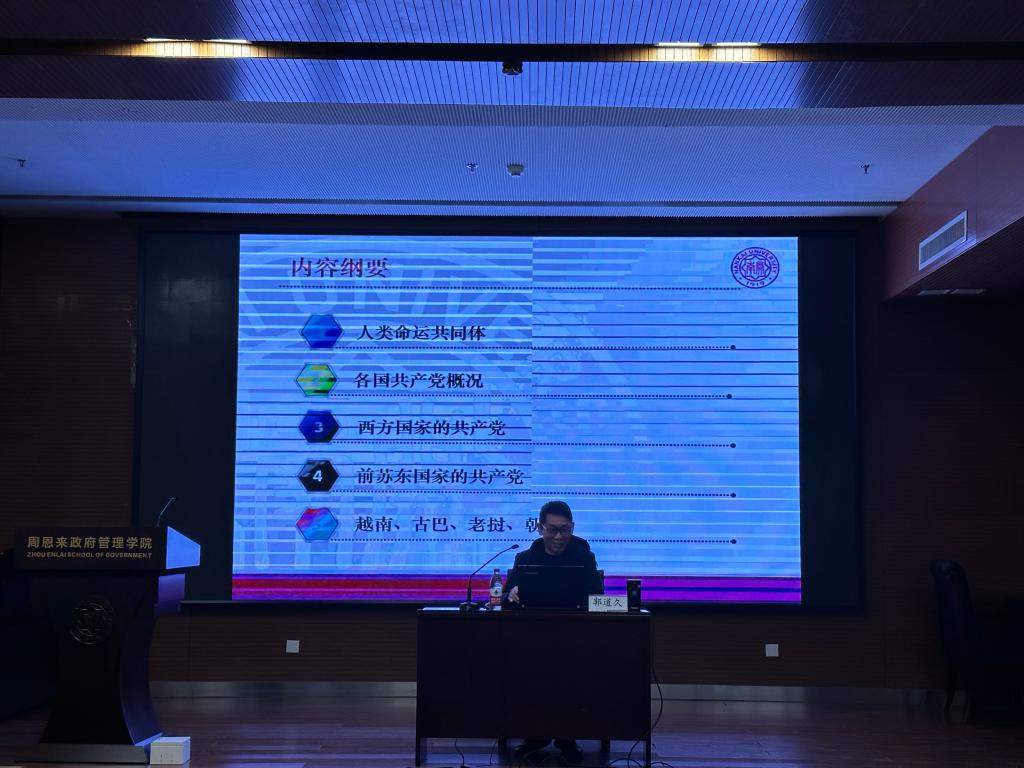 积极分子培训班邀请学院政治学系系主任郭道久教授讲授题为“人类命运共同体观下的世界各国共产党”的专题党课,100余名入党积极分子、入党申请人参加。