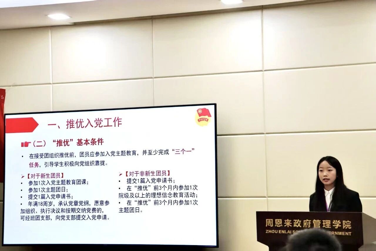 院团委组织部考核评优中心负责人王艺帆结合学院团组织发展现实需求,从推优入党、达标创优、五四评优和团费收缴四方面入手,为各团支书详细讲解相关事宜与注意事项。发言重点强调了推优入党等重要工作的严肃性纪律性, 并列出多项细则供团支书参考应用,为本学期团务工作的顺利推进奠定了坚实基础。