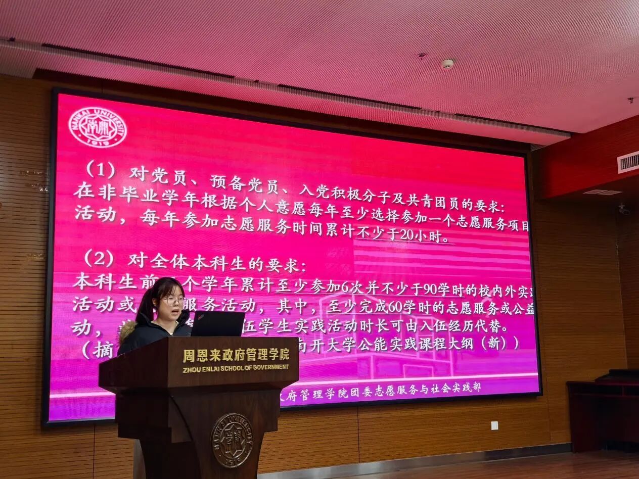 随后,实践考评中心的负责人邹含瑜同学为大家详细说明了志愿服务与社会实践时长的相关规定,并结合美国A片