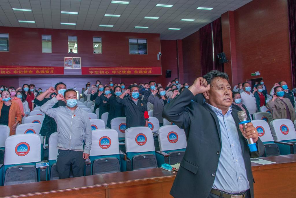 “我志愿加入中国共产党,拥护党的纲领,遵守党的章程,履行党员义务,执行党的决定……”课程最后,达孜区中心小学全体党员教师在扎西多杰带领下,重温入党誓词,向党深情告白。