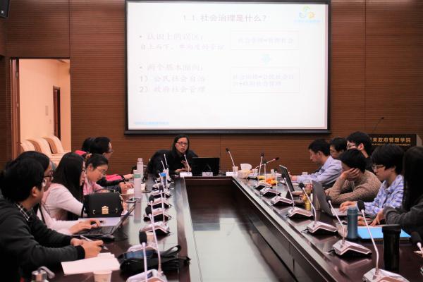 周老师首先根据自己的研究从对社会治理的理解、当前社会治理的特点与现状以及社会治理改革破题等几方面深入讲解了当前社会治理的状况和创新趋势。在对社会治理的认识上,周老师提出应从公民社会自治和政府社会管理两方面来理解社会治理,从社会管理到社会治理首先是一场政府改革,在社会治理中政府应该积极转变其职能;接着周老师着重谈论了当前社会治理的特点与现状,她分别从主体、结构、方式和绩效四个方面谈论了当前社会治理的特点,又分别通过五大重要问题探讨当前社会的治理现状;最后提出社会治理改革的破题——关键在理念转变。