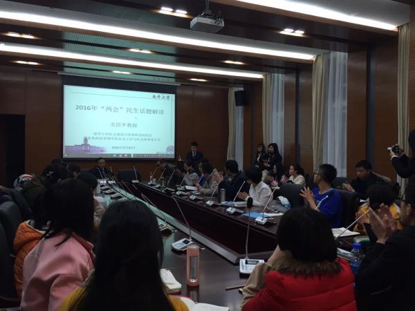 教授、博士生导师关信平老师为在场师生对今年“两会”民生话题作了全面解读。