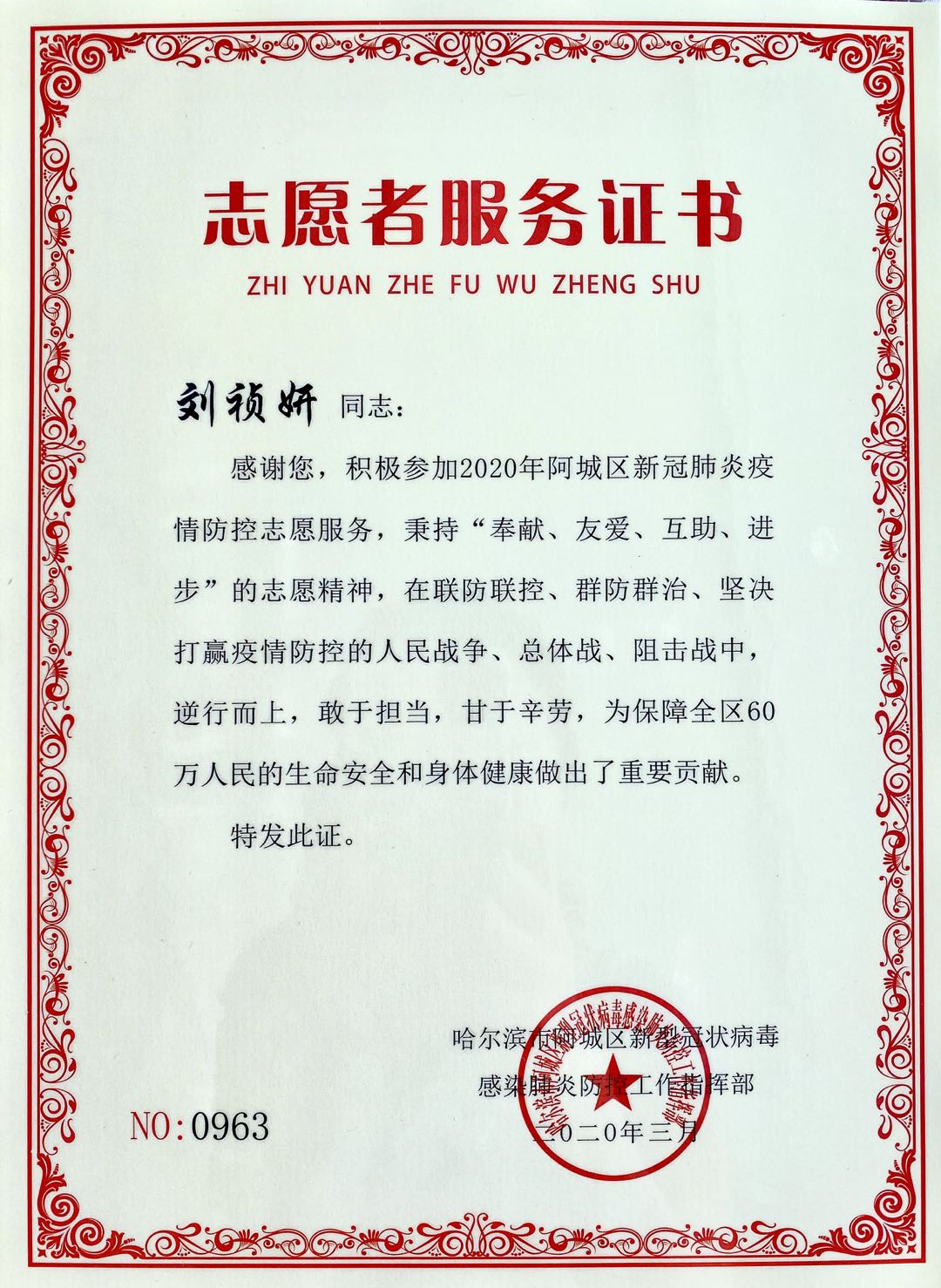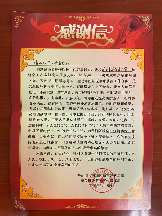 自新冠疫情爆发后,刘祯妍同学主动到家乡哈尔滨市阿城区委、区政府新冠感染肺炎疫情防控工作指挥部报道,并发挥自己社会工作专业特长,投身社区疫情防控的最前沿。顶风雪、战疫情,不惧艰险,累计参加志愿者服务100余小时,在抗击新冠疫情的战役中,诠释了“允公允能,日新月异”的南开校训,弘扬了伟大的南开爱国主义精神,得到了各级领导、社区干部和广大居民的一致认可和称赞。