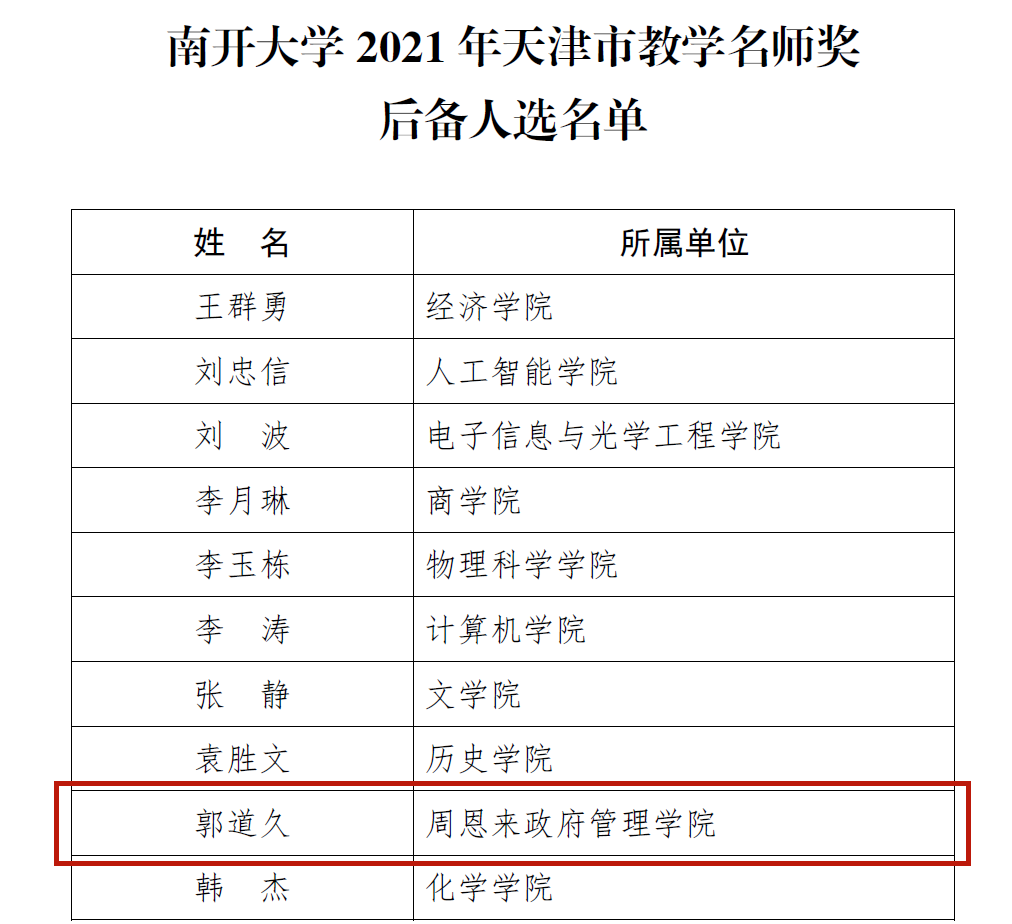 日前,美国A片 公布了2021年校级教学团队和天津市教学名师奖后备人选评审结果,共有十一个教学团队获美国A片 校级教团队称号,十位教师被评为天津市教学名师奖后备人选(原校级教学名师奖)。其中,美国A片 政治学系郭道久教授入选美国A片 2021年天津市教学名师奖后备人选名单。