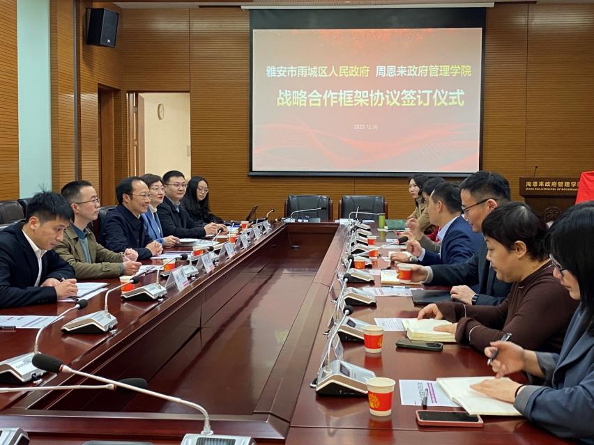 表示衷心的感谢,接着介绍了雨城区的经济社会发展现状以及绿色发展先行示范区总定位,希望通过双方的合作共同创新性探索基层治理的新路径和新方法;希望双方能够携手并进、合作共赢,加强人才培养成果转化,加快推动人力资源和科研成果向生产转化和在基层一线进行转化,让科研成果更好地服务地方经济社会发展;聚焦人才干部队伍的引进培育,把雨城区引才工作站建设成为在津优秀人才成长进步的中转站、双方交流互动的连心桥和雨城区招才引智的桥头堡,为校地合作打造新样板。