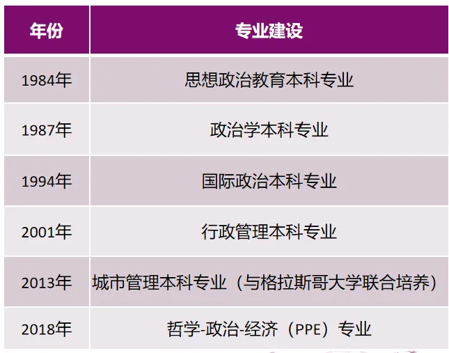 政治学重建以来,一直重视专业和学科建设问题。1984年设立思想政治教育专业,1987年设立政治学专业,1994年设立国际政治专业,2001年开设行政管理专业,2013年设立城市管理专业,2018年开设PPE专业。
