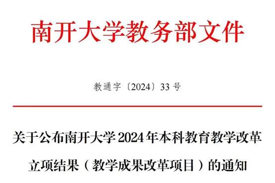 2024年本科教育教学改革立项名单(教学成果改革项目)》。根据《关于开展 2024 年本科教育教学改革立项工作的通知》(教通字〔2024〕2 号)安排,经各教学单位申报、教务部形式审查、专家组评审、拟立项名单公示,确定立项教学成果改革项目 88 项。