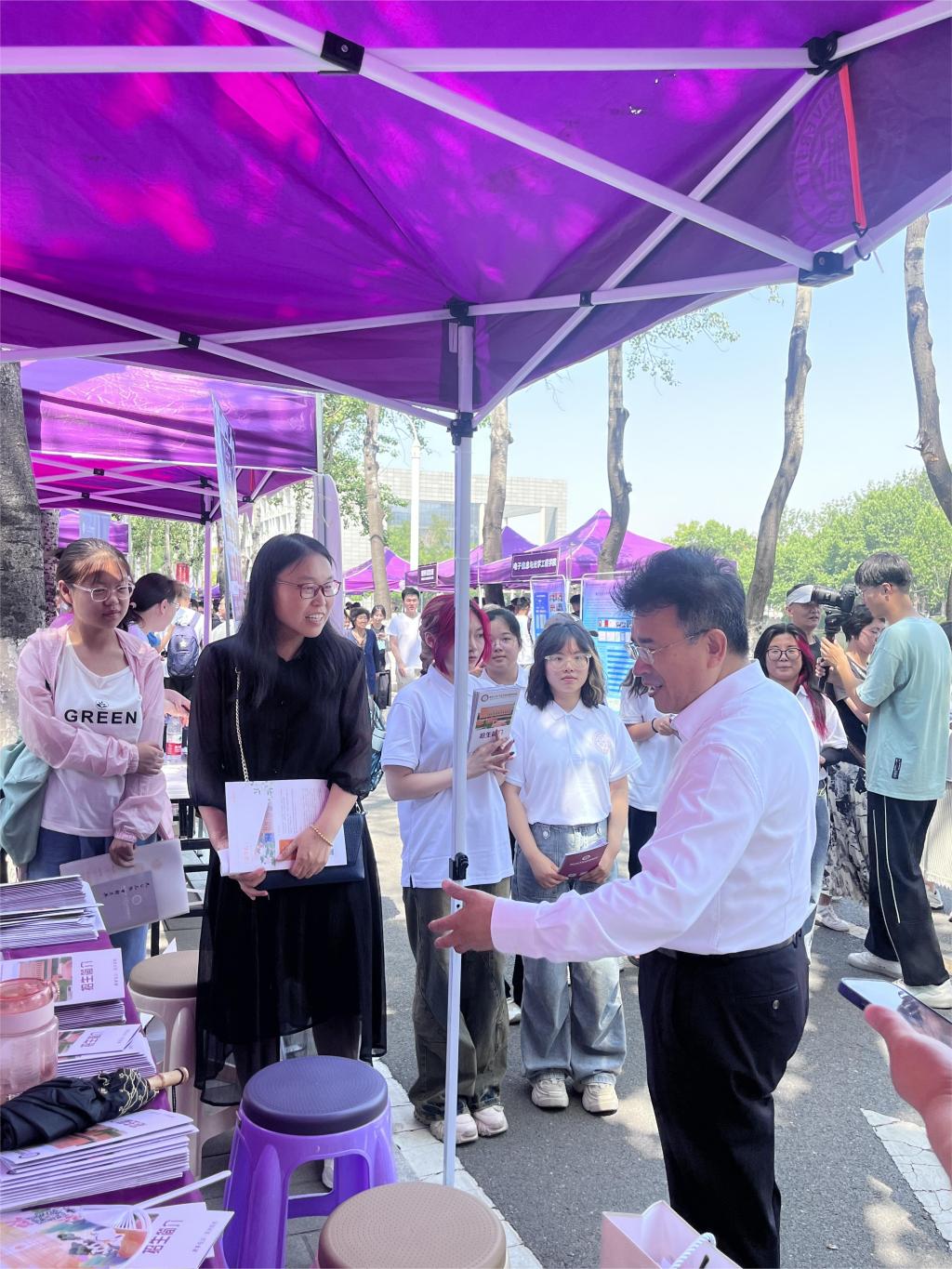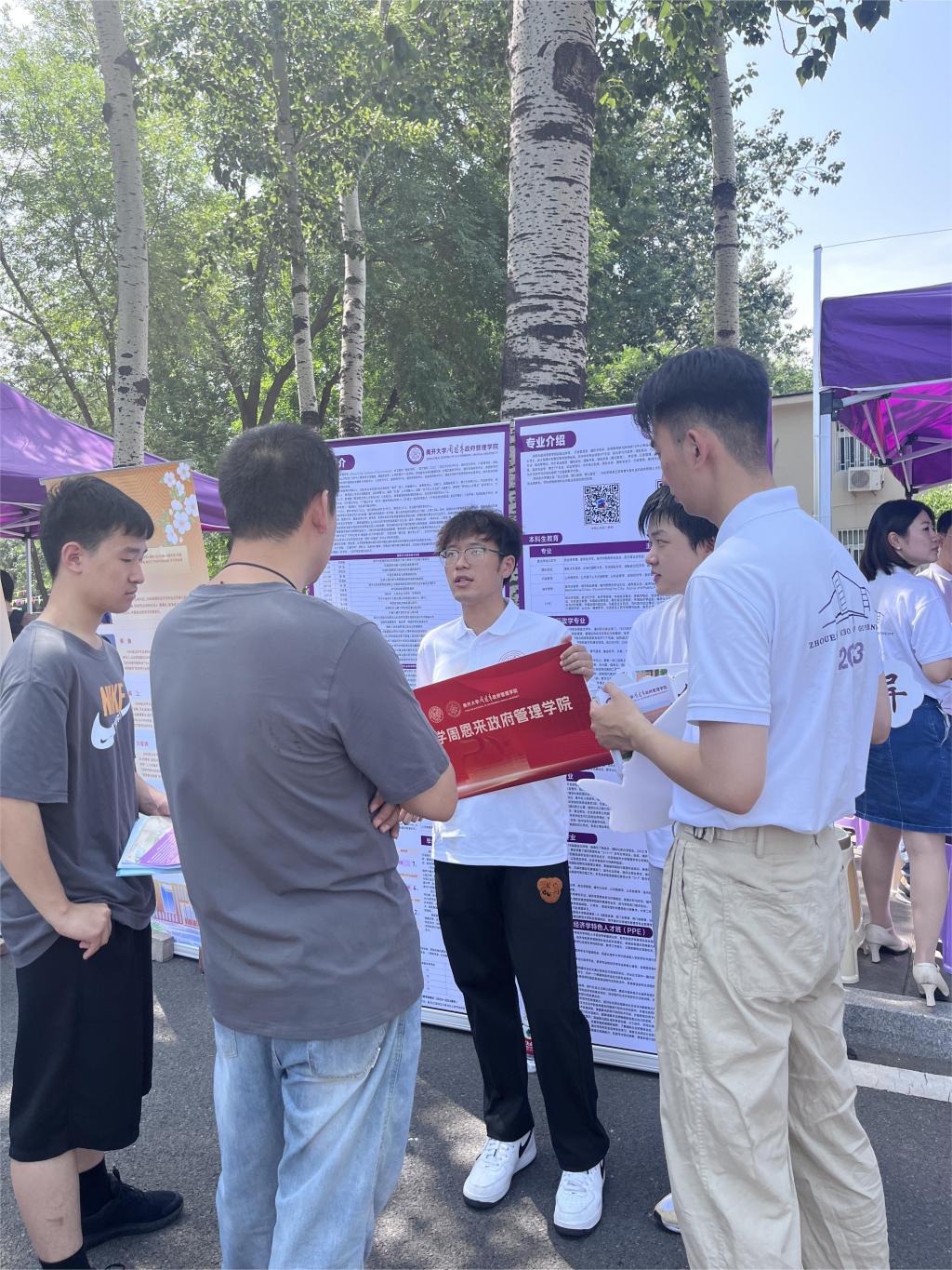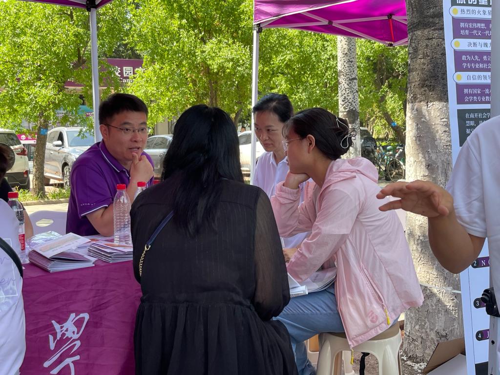 院长吴晓林,副院长郭道久,副院长张宁,各系教师代表、辅导员、学生志愿者等组成招生宣传队,在大中路旁设置点位,面向高考考生、家长开展招生咨询。