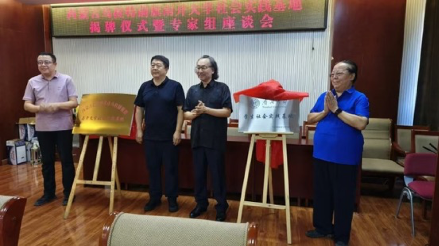 陈巴特尔教授、内蒙古师范大学巴▪孟和教授一起为基地揭牌。