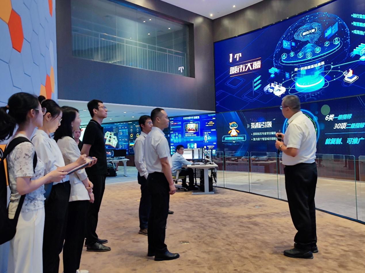 师生首先来到中新生态城的“城市大脑”调研参观,中新天津生态城数据局局长王喆向详细介绍了“城市大脑”的基本组成、3大基础平台和17个智慧模块。中新天津生态城“城市大脑”通过设立指标引领,将资源、职能、能力等全要素集成整合,开发导向产品,最终服务于具体应用。