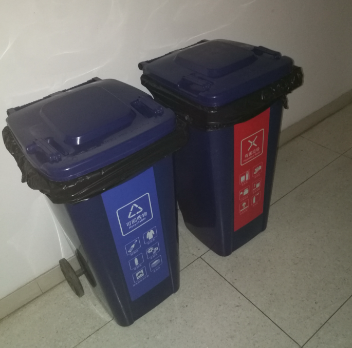 3. 可回收物桶:每层放置2个,分别摆放在北侧楼道尽头和南侧开水间内,除了一楼南侧的摆放在114室附近。