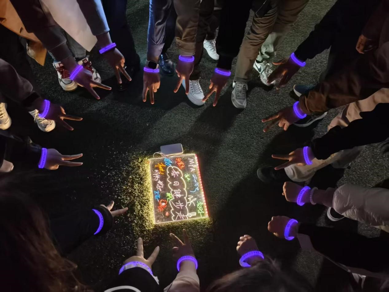 来到操场,充满仪式感的环节便拉开序幕。同学们先是领取寓意美好的贴纸,再登录小程序进行双打卡验证,打卡成功后领取活动物料,凭借这些 “小道具”,能快速找到 “大部队” 的踪迹。一个个印着校徽的发光胸章,是我们集结的重要标志;“哥你是钢铁侠吗,怎么你的胸口在发光?”是其他同学朋友圈里的打趣和调侃;月色下,荧光棒和小星星就是我们的战衣,小飞机随风闪闪发光,见证我们的笑语欢歌。