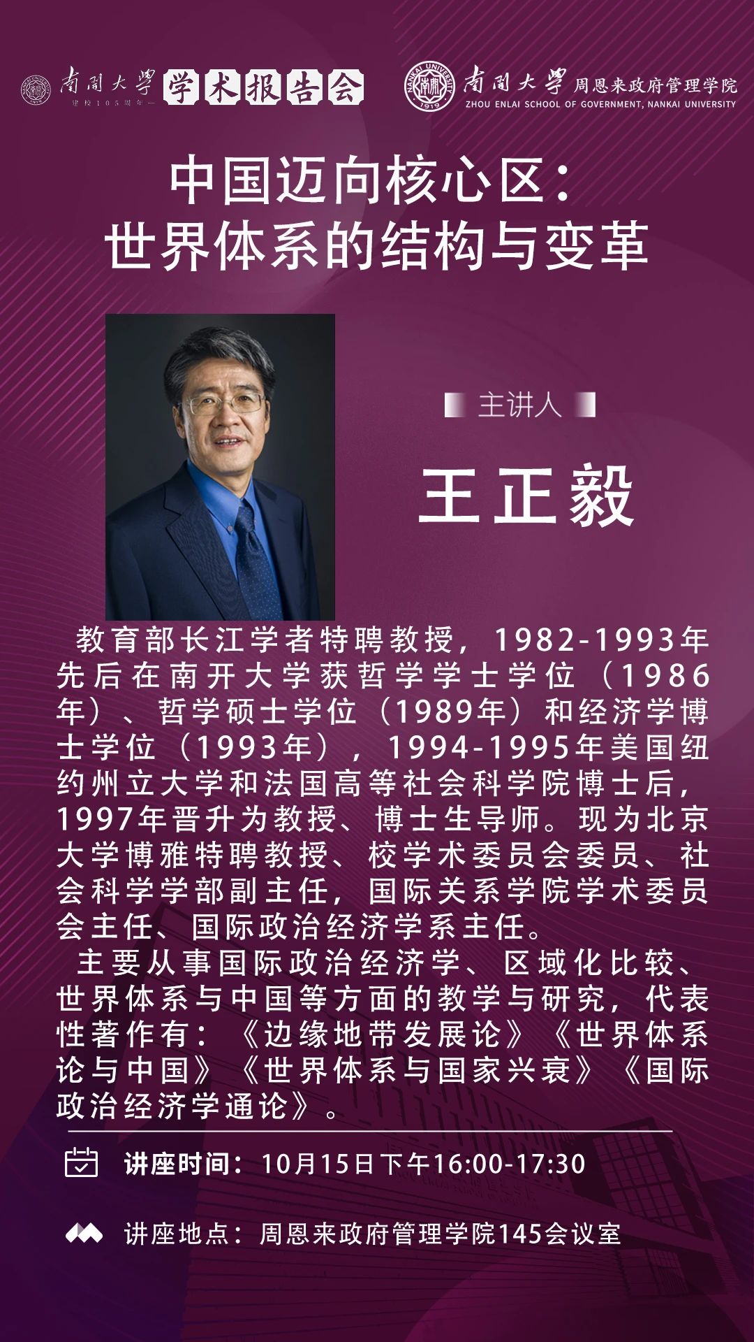 美国A片 建校105周年学术报告会|王正毅:中国迈向核心区:世界体系的结构与变革