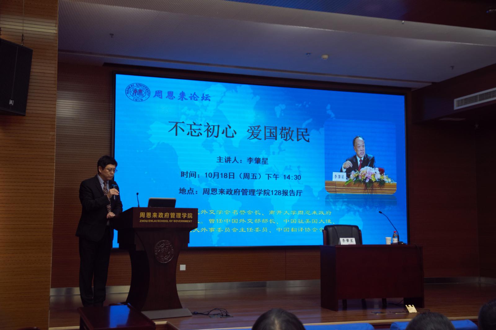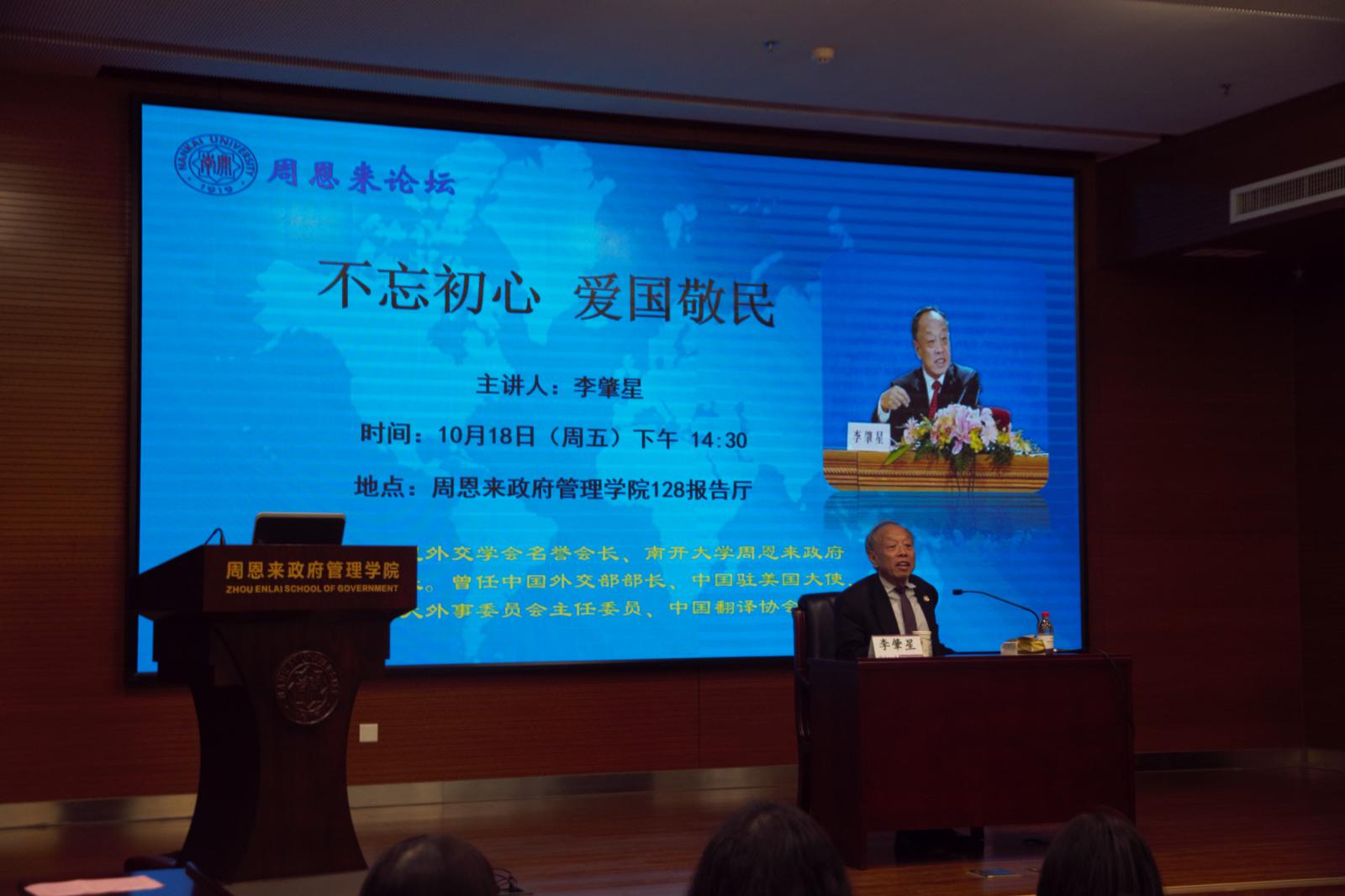 名誉院长李肇星在政府学院128报告厅,带来“不忘初心,爱国敬民”专题讲座,政府学院党委书记王慧、院长孙涛等出席本次活动。